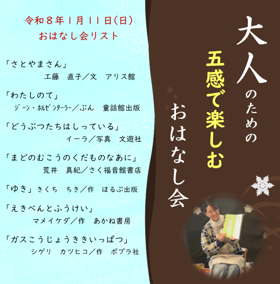 宮崎市立図書館 > お知らせ > 大人のためのおはなし会を行いました 大人のためのおはなし会を行いました 公開日:2026年1月15日 蔵書検索 メニュー 図書館利用案内 施設案内 カレンダー 駐車場について 宮崎市立図書館ボランティアについて 学校の皆様へ 視聴覚教材・機材の利用案内 行事・イベント案内 館内展示のご案内 講座案内 配本について 購読新聞一覧 購読雑誌一覧 大型絵本一覧 寄贈のお願い おすすめの本 ライブラリー・ナビ(リーフレット) 朗読CD リンク集